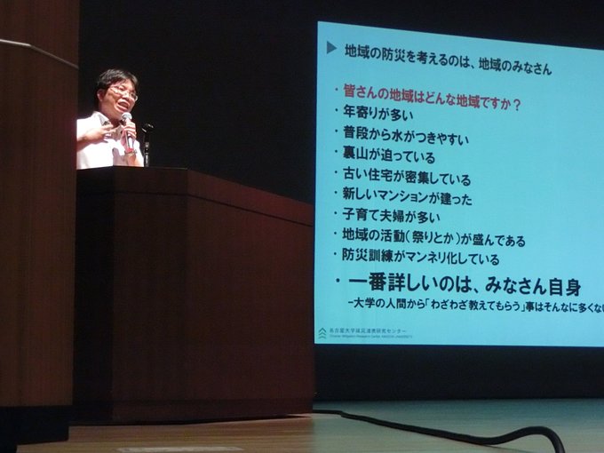 - 豊明市防災講演会第二部は、名古屋大学減災連携研究センター 強靱化共創部門 特任准教授 倉田和巳氏による講演、「データで読み解く南海トラフ地震 〜自助・共助・公助で備えるべきことは?」です。 防災に正解はない、置かれている状況は様々だから。自分で考えることが必要。 pic.twitter.com/Z5WX3lIknK posted at 14:44:10